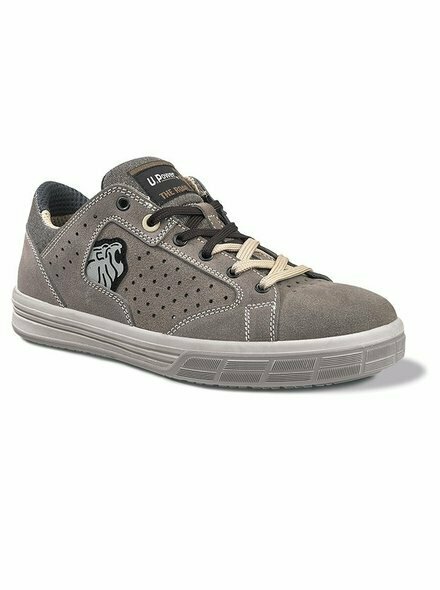 Scarpe antinfortunistiche basse, leggere e comode u power della linea The Roar, con tomaia in morbida pelle scamosciata forata, puntale in alluminio, antiperforazione, antiscivolo e suola PU/PU LIGHT GRIP, S1P SRC